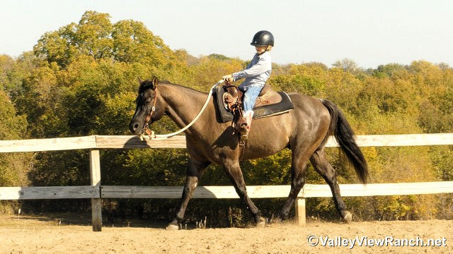 Larry, or affectionately called "Lair-Bear", is a once in a lifetime partner. We have known Larry for over a year and he has been very special to our family! Larry is one of the sweetest, most well-rounded horses you can find and completely sound with no maintenance requirements. He is always ready to go to work/play and meets you at the gate. He loves attention and is one that is always a pleasure to spend your time with! Rebecca, 7 years old, Ben , 5 years old and our sweet friend , 8 years old have been having so much fun putting on "Heartland Performances" with Larry. After our little friend asked for The Sit for the first time ever, her eyes got big and she said, "I can't believe you can teach him that!!". Oh, the confidence and friendship with the horse that the tricks can inspire! He has a wonderful personality, always happy to see you! He is soft, low headed and loves attention. He knows the Lay Down, The Sit and Side-pass for Mounting. Larry was originally started as a late 2 year old, probably the reason he is so sound! He was successfully prepared and shown as a 3 year old at the futurity, barely missing the 2nd round. He was used throughout his 4 year old year to help start/pony colts, was stared in the Reined Cow Horse and roping and doctoring outside cattle. Larry has a flying lead change, spins, slide stop, will pick up either lead from a standstill, and pivot on the hindquarters and forequarters, side passes, backs circles, neck reins and direct reins and rides anywhere bridle-less! Larry never misses a beat! He will do all the obstacles, open gates forward and backwards, teeter-totters, bridges, crosses water, tarps, flags, gunfire, fireworks, you name it!! He has excellent ground manners, easy to bathe, groom, catch, lead, load, haul, stands tied well, easy to pick feet, saddle, bridle, stands for mount and dismount, and quiet for the vet and the farrier!