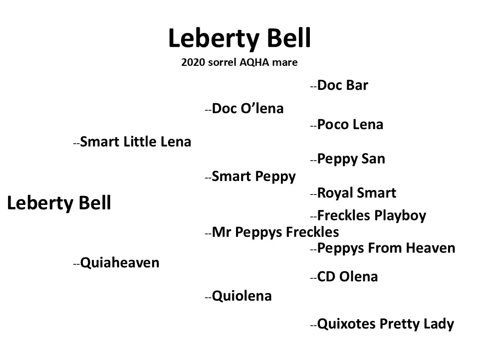 Leberty Bell is a five year old OWN daughter of Smart Little Lena out of a NCHA earning daughter of Mr Peppy Freckles! Bell is a super sweet mare with nice gaits, a soft face, a beautiful handle and a solid, quiet mind! She is so sweet and loves her job. Bell has been trained and shown in the cutting. She has an excellent handle and tries hard to please. She is soft, willing, has a perfect neck rein, works gates, and goes outside well. She would quickly make a versatility show horse. She is easy to catch, bathe, tack up, stands for mount and dismount, ties, leads, loads, hauls, and is super about new places and situations. Ride her and breed her!